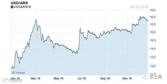 2016年1月1日,美元对阿根廷比索的汇率是12.9464,截至今天的汇率是15.5540,贬值26076个基点,贬值幅度达20%。