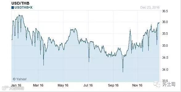 2016年1月1日,美元对泰铢的汇率是36.2006,截至今天的汇率是36.0330,升值1676个基点,升值幅度4.6%。