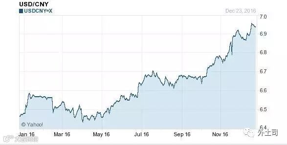 2016年1月1日,美元对人民币的汇率是6.4935,截至今天的汇率是6.9462,贬值4527个基点,贬值幅度达6.97%。