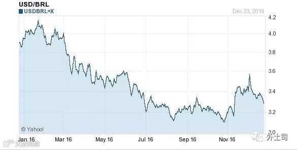 2016年1月1日,美元对巴西雷亚尔的汇率是3.9048,截至今天的汇率是3.2763,升值6285个基点,升值幅度16%。