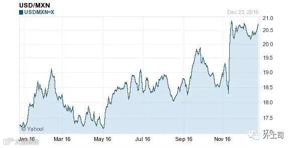 从曲线图可以看到,墨西哥比索和人民币一样,一整年几乎都再贬值。特别是当特朗普选举获胜后发表了一系列对墨西哥贸易不利的言论,墨西哥比索跳水贬值。