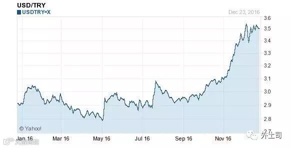 2016年1月1日,美元对土耳其里拉的汇率是2.9180,截至今天的汇率是3.5253,贬值6073个基点,贬值幅度达20.81%。
