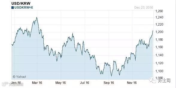 2016年1月1日,美元对韩元的汇率是1172.0032,截至今天的汇率是1208.9000,升值368968个基点,升值幅度3.1%。