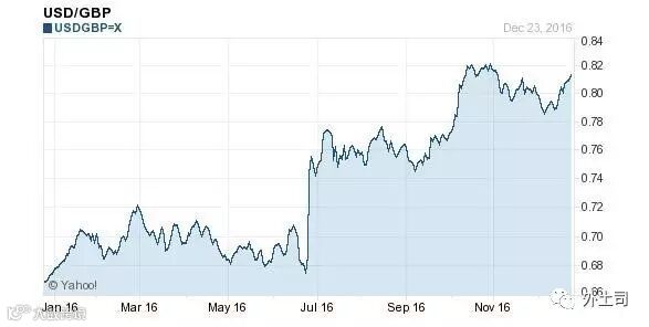 2016年1月1日,美元对英镑的汇率是0.6748,截至今天的汇率是0.8150,贬值1420个基点,贬值幅度达21%。