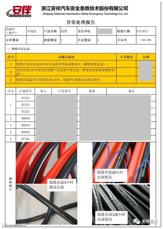 安伴技术品控部门第一时间启动重大质量异常追溯机制,在查清线缆塑料绝缘层出油原因为供应商提供的原料不符合标准后,形成质量异常报告提交公司总经办,同时,通知生产部门紧急隔离问题产品。