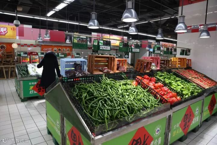在成都家乐福青白江同华店,各类蔬菜、米、面、粮油等备货充足。