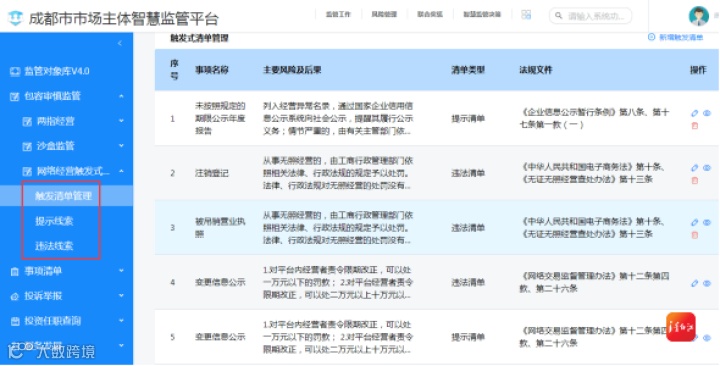 此种监管模式指以信用为标准划定一个“监管沙盒”,设定监管底线、触发条件,对“盒子”里面的企业实施系统智慧化风险提示和“无事不扰”“首违不罚”等柔性监管措施,同时对达到风险触发条件的移出“信用沙盒”,依法依规开展后续监管,在可控范围之内守住安全底线。在实施中,区市场监管局通过网络交易平台“积微物联”开展该项试点,创新搭建市场监管部门、平台经营者和平台内入驻经营者三者共同治理的数字化快车道,真正落实“有求必应”。