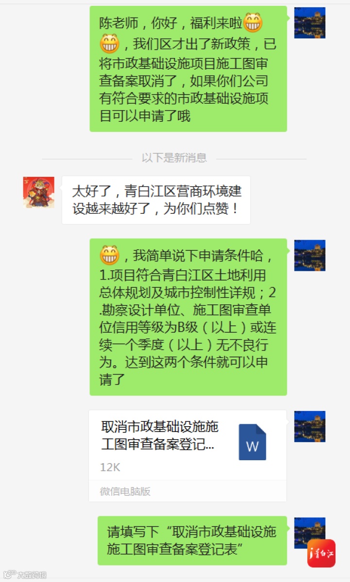 “以前办图审备案不仅要跑窗口,还需要准备全套施工图设计文件、施工图设计文件审查等4项资料,现在仅需填写一张登记表,而且不用跑路,真是太方便了。”今年3月,青白江区同创北一路项目经办人陈益康在体验了区审批和营商环境局“施工图审查备案”办事新模式后,十分感慨。