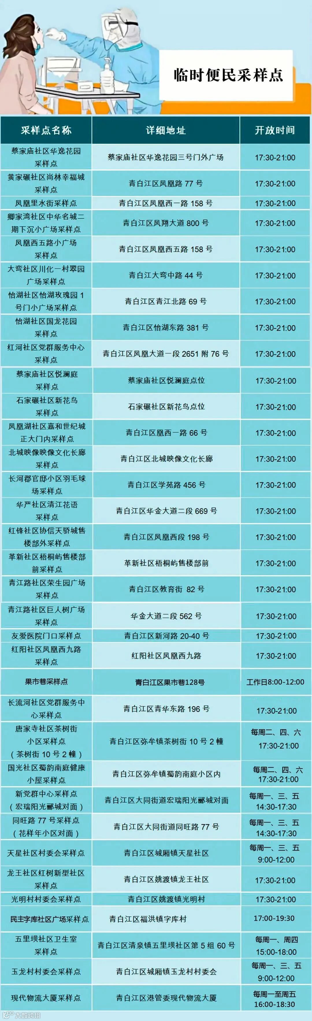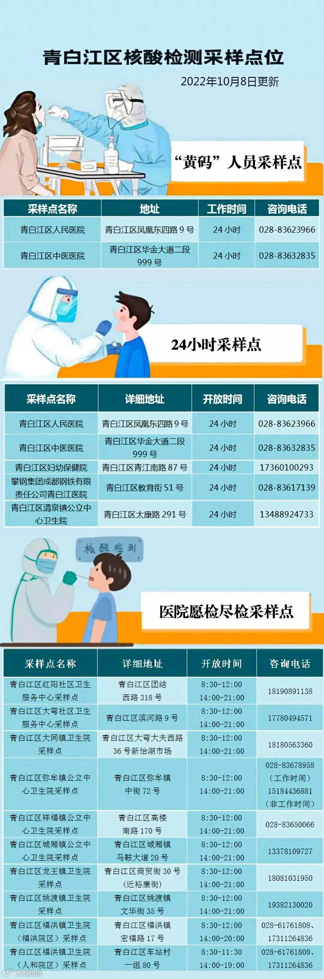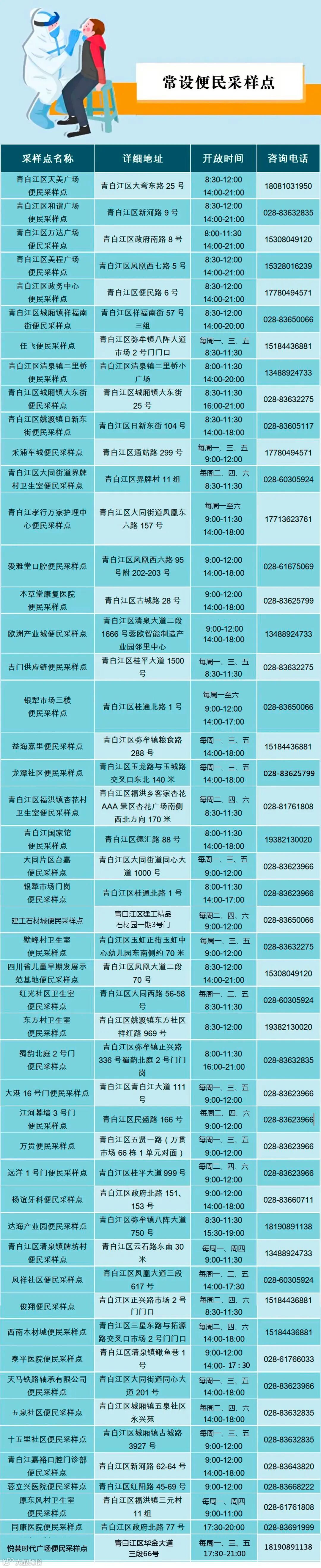 为满足市民朋友核酸检测需求,现将青白江区近期核酸检测点位信息及开放时间公布如下,如遇高峰时期,请各位市民朋友配合疫情防控要求,文明排队,正确佩戴口罩,保持间隔距离,耐心等候采样。疫情防控需要大家的共同努力,文明典范城市创建需要大家的共同配合。