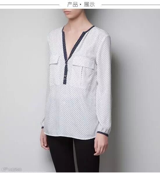 衬衫,45元。波点雪纺衬衫,大V领,修饰脸型,优雅大方。