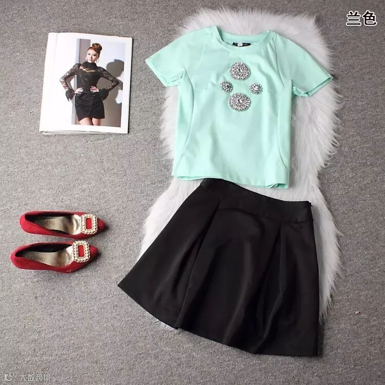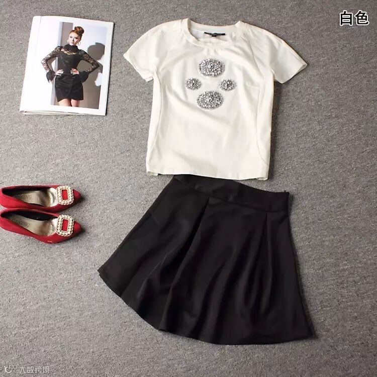 套装,150元。半袖+半裙套装,钉钻花装饰,清新可爱。