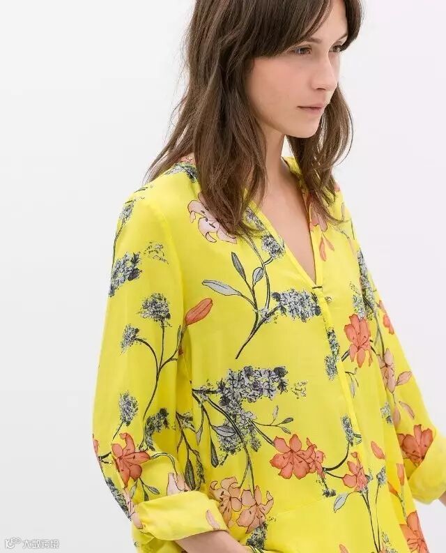 衬衫,70元。印花衬衫,面料柔软,手感光滑,穿着舒适,大V领,优雅知性。