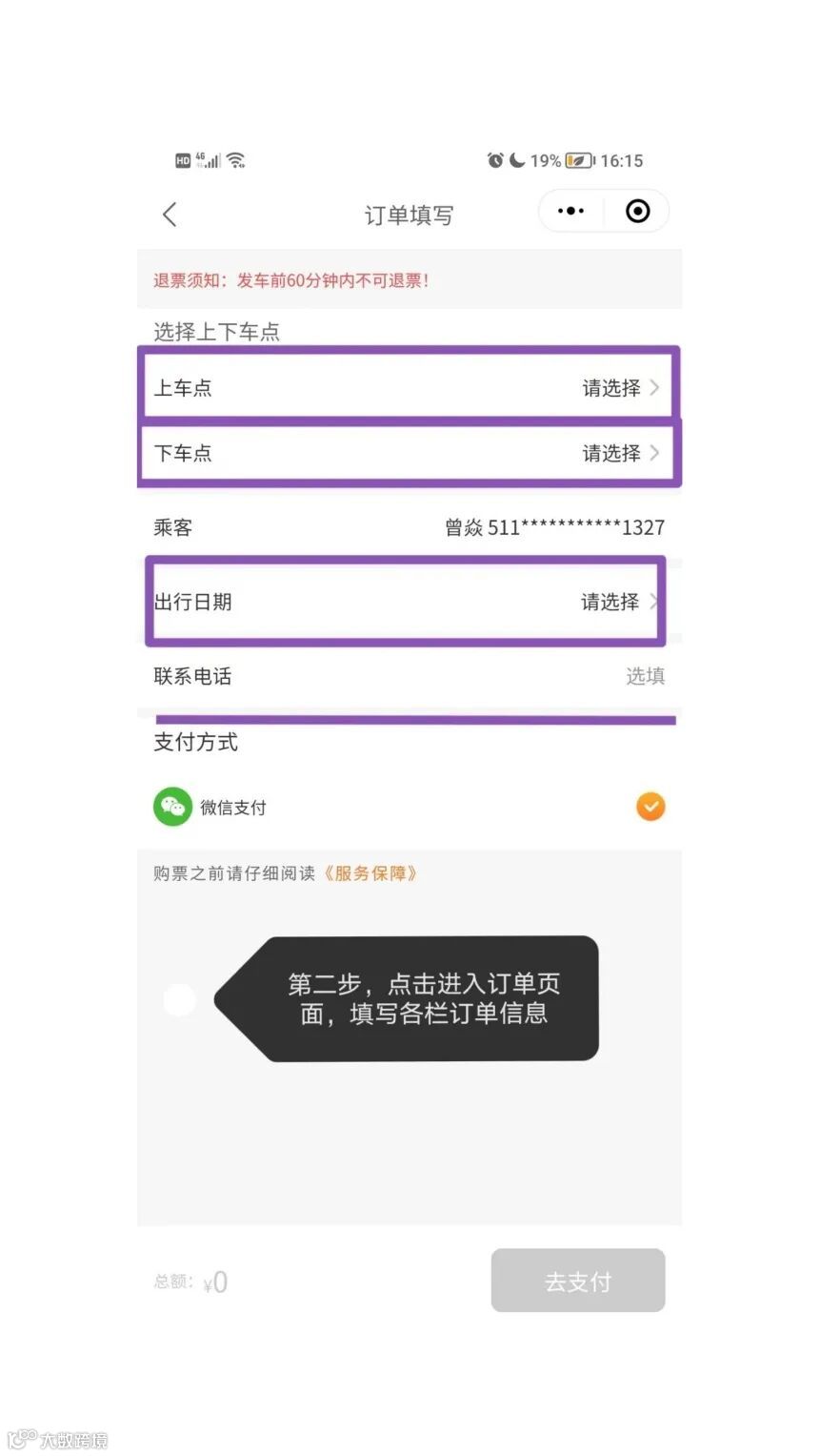 点击进入订单页面,填写各栏信息,乘车时间可一次性勾选多天。