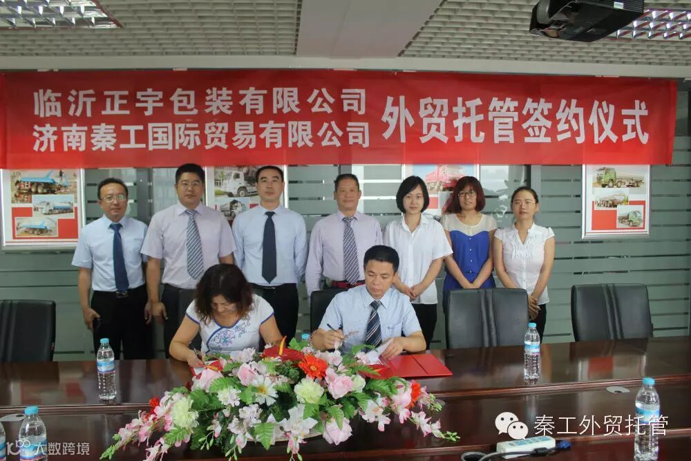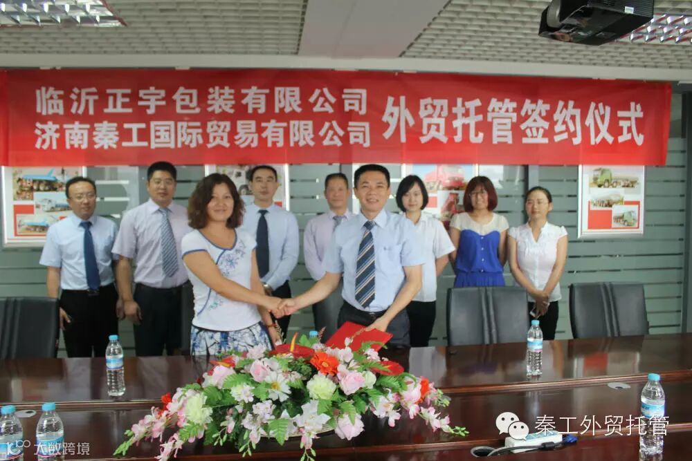 会谈结束以后,秦长岭董事长和杜春玲董事长分别代表双方公司签署外贸托管协议,双方参会领导共同见证签约。