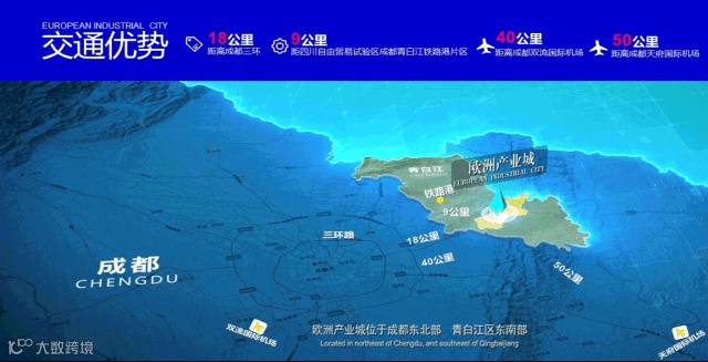 欧洲产业城距四川自由贸易试验区成都青白江国际铁路港片区仅9公里,进出口贸易极其方便。