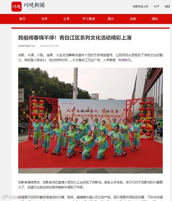 2月2日,川观新闻以“民俗闹春嗨不停!青白江区系列文化活动精彩上演”为题,报道了我区开展“成都文化四季风 民俗闹春”2022年青白江区非遗过大年文化活动,精彩多样、非遗味十足的节目丰富了人民群众的精神文化生活,宣传了优秀传统文化等相关情况。