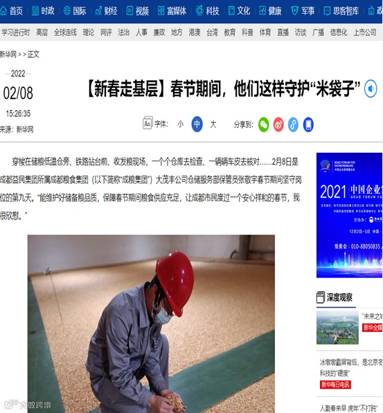 2月8日,新华网以“【新春走基层】春节期间,他们这样守护‘米袋子’”为题,报道了春节期间,成都益民集团所属成粮集团大茂丰公司仓储服务部保管员张敬宇和同事坚守在工作岗位,全力做好应急保供的各项任务,保障粮食供应充足等相关情况。