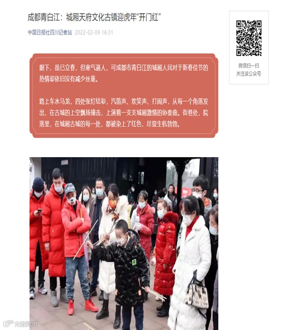 2月9日,中国日报社以“成都青白江:城厢天府文化古镇迎虎年‘开门红’”为题,报道了春节期间,城厢天府文化古镇以“菁彩芳华 新春游乐会”为主题开展了系列丰富多彩的迎新活动,不仅丰富了群众的精神文化生活,还推动了地区经济发展等相关情况。