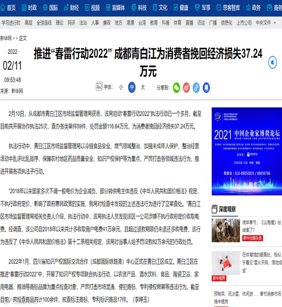 2月11日,新华网以“推进‘春雷行动2022’ 成都青白江为消费者挽回经济损失37.24万元”为题,报道了区市场监管局启动“春雷行动2022”执法行动,大力打击各领域违法行为,为消费者挽回经济损失37.24万元,并成立四川省知识产权国际交流合作(成都国际铁路港)中心,实行知识产权专项联合执法行动等相关情况。