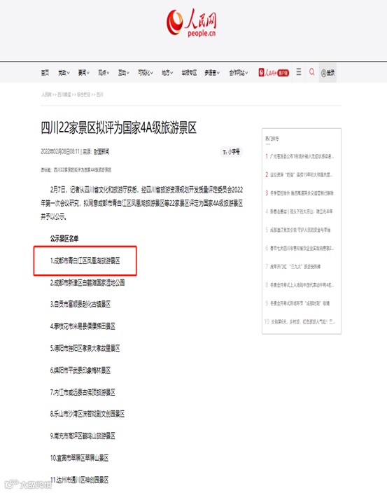 2月8日,人民网四川“四川22家景区拟评为国家4A级旅游景区”一文提到,包括凤凰湖旅游景区在内的22家景区被评定为国家4A级旅游景区进行公示等相关情况。