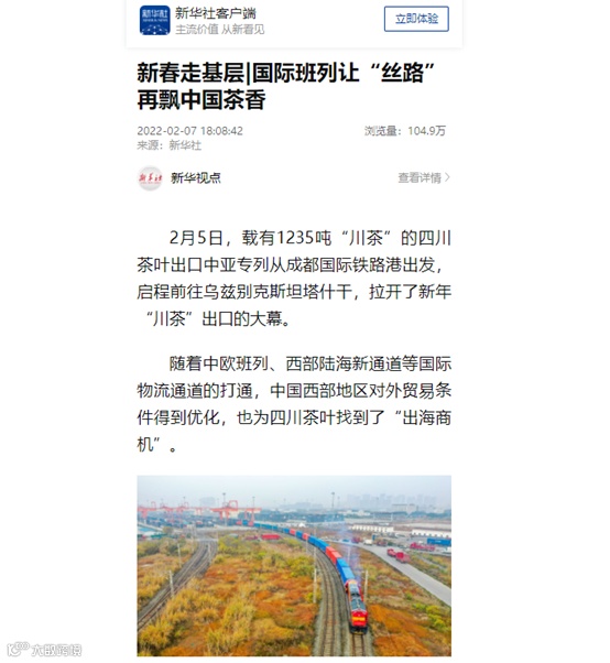 2月8日,新华社客户端以“新春走基层|国际班列让‘丝路’再飘中国茶香”为题,报道了5日,2022年首列四川茶叶出口中亚专列从成都国际铁路港出发,启程前往乌兹别克斯坦塔什干,这是川茶出口中亚的第3趟专列,未来我省将在优势产业基础上加强培育,持续提升特色农产品出口能力等相关情况。