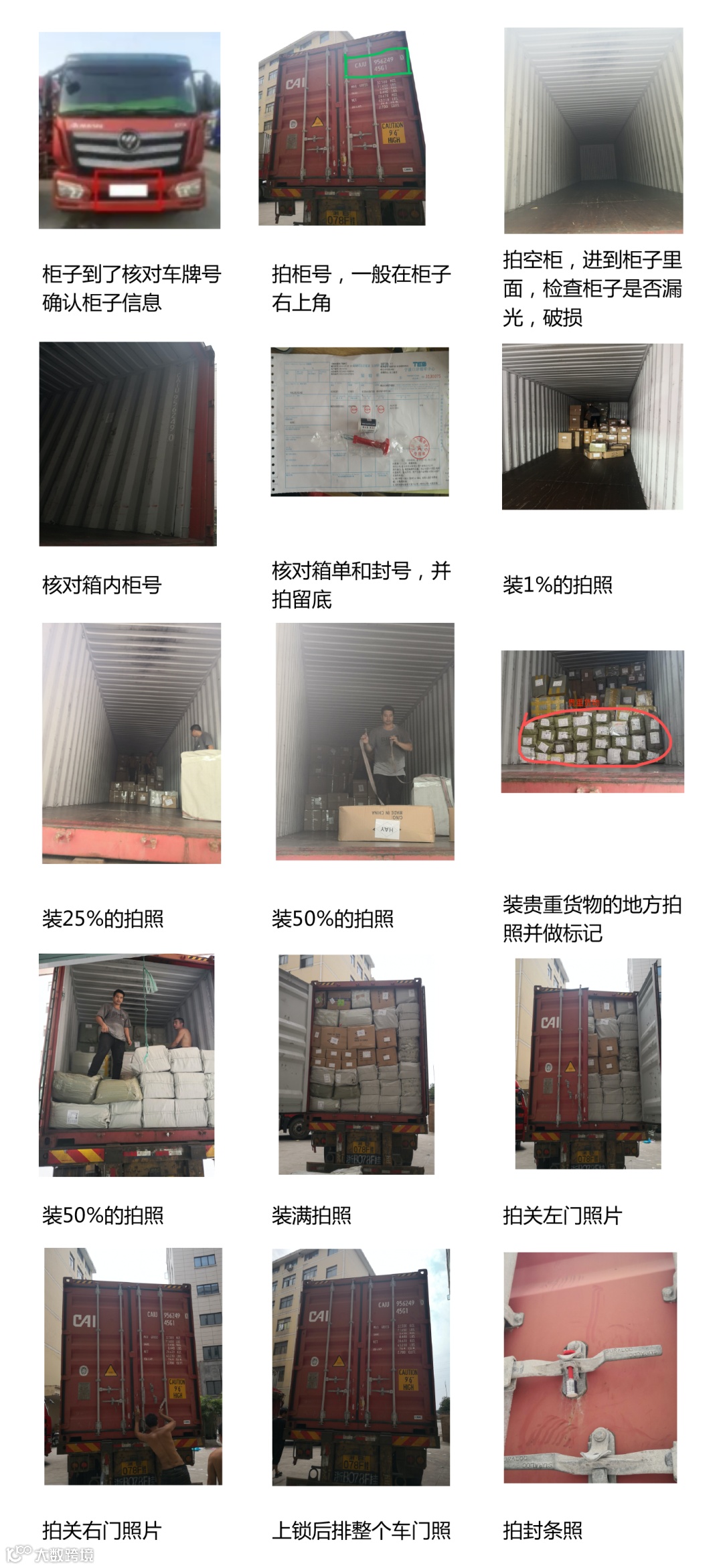 ◦ 装载至75%,若含贵重货物,可多拍几张,为客户卸柜时确认货物位置提供依据。