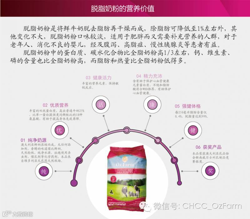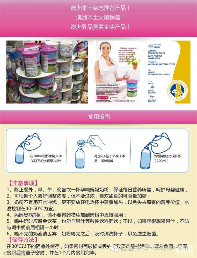 OZ FARM孕哺妈妈奶粉,采用先进的湿混加工技术,100%澳大利亚原装进口,生产符合HACCP和GMP标准,产品达到世界上最严格的监管标准,保证每罐产品均来自澳大利亚。本品富含多种营养素,维他命和矿物质,能够确保胎儿的视力、脑力及听力的健康发育,并帮助哺乳期的妈妈促进排乳,保护妈妈和宝宝健康!产品在澳大利亚成为畅销产品,备受中澳妈妈的信赖!