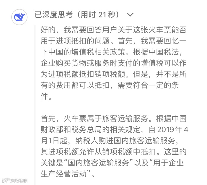 财务人可以上传一张发票,让Deepseek进行深度思考,比如下边这个: