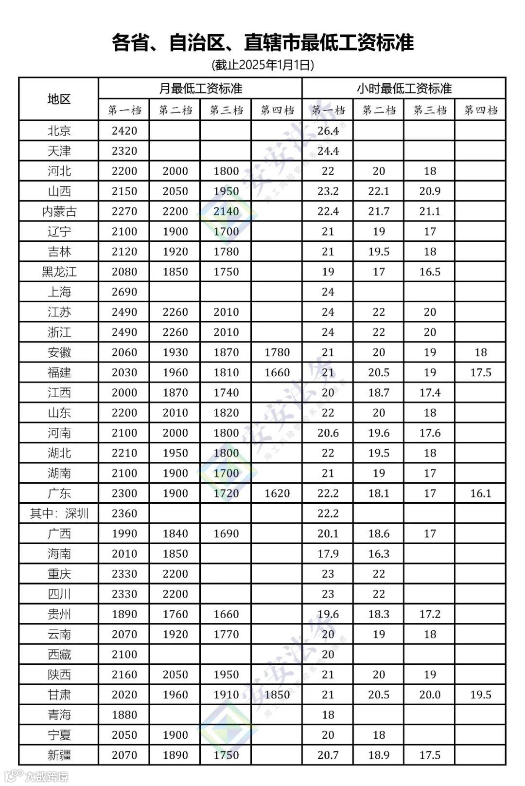 法律赋能及解决方案||最新!2025.1.1全国各省市最低工资标准