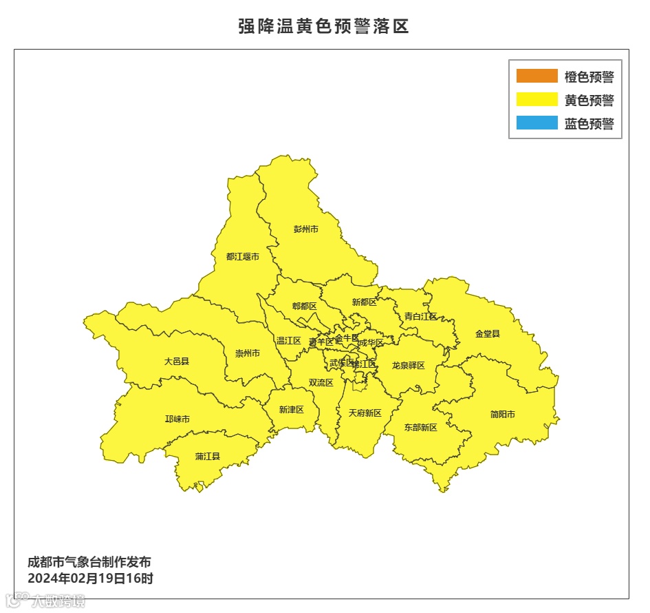 成都市气象台2024年02月19日16时00分发布强降温黄色预警:受强冷空气影响,20日晚上开始至24日,我市有一次强降温天气过程。日平均气温将累计下降7~9℃,日最高气温中东部将降至8℃左右,西部将降至5℃左右,日最低气温中东部将降至3℃左右,西部将降至1℃左右,高海拔地区最低气温可降至0℃以下。21日白天到夜间我市将出现4~6级偏北风,山口河谷地区可达7级或以上。过程期间我市大部分地方将出现小雨或间断小雨,高海拔地区有雨夹雪或小雪。请注意防范。
