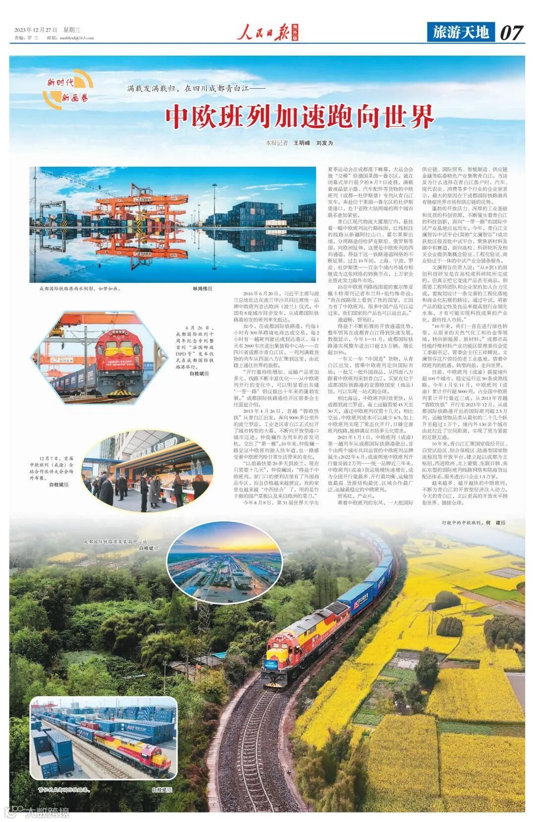 12月27日,人民日报海外版以《满载发满载归,在四川成都青白江——中欧班列加速跑向世界》为题,发布整版报道,面向海内外推介青白江以更高的开放水平拥抱世界、链接全球的举措和成效。