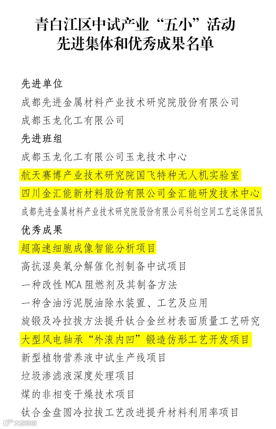 近日,青白江区中试产业“五小”活动先进集体和优秀成果评选活动结果公布,评选出成都先进金属材料产业技术研究院股份有限公司等2个先进单位,成都玉龙化工有限公司玉龙技术中心等4个先进班组,超高速细胞成像智能分析项目等10个优秀成果。