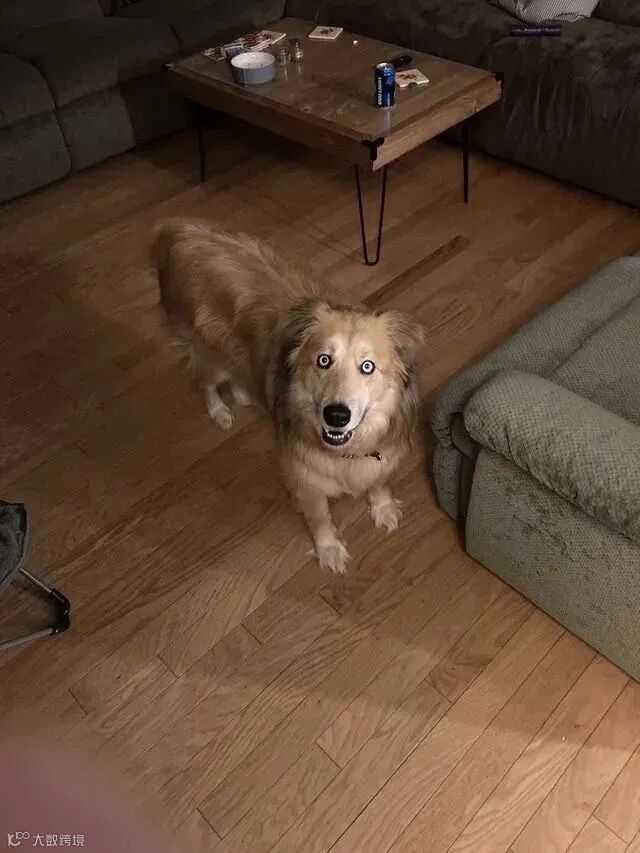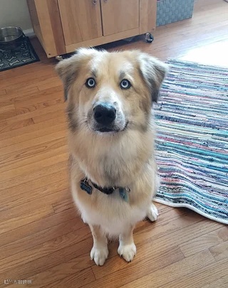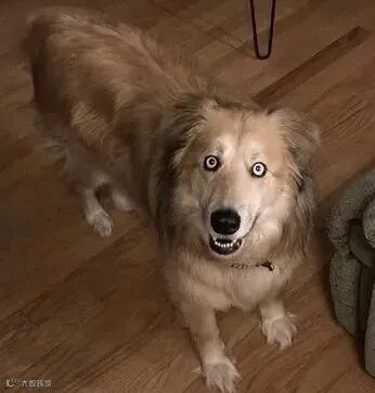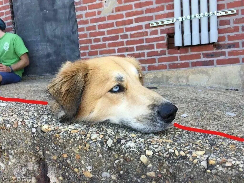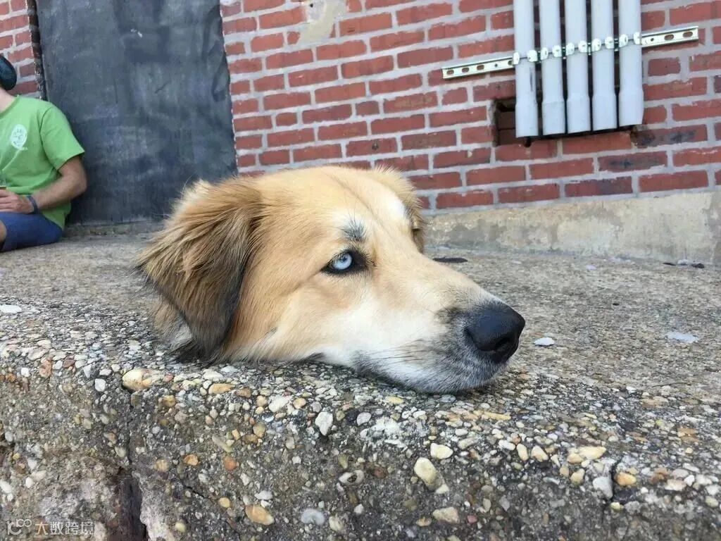 狗狗名叫Bleuregard Q. Kazoo,今年2岁,是金毛和二哈的混血,照片是Kazoo身子躺在斜坡上,头放在台阶上拍的...