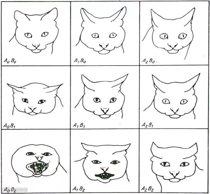 早在19世纪70年代,就有欧洲动物专家在总结了大量的猫咪表情行为后,提出一个猫咪表情的框架“九宫格”[3]👇