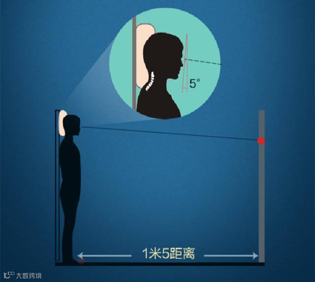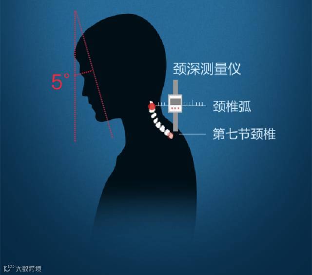 用电子颈深测量器,如图所示进行测试,在显示屏上会出现您的颈椎弧深度,以得出您需要睡的枕头高度。