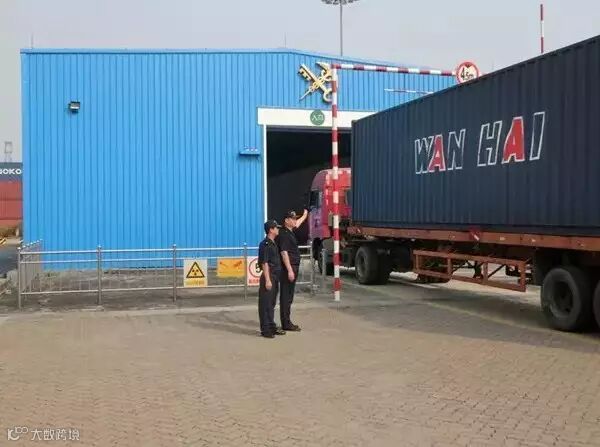 海关关员引导货柜车驶入检查室