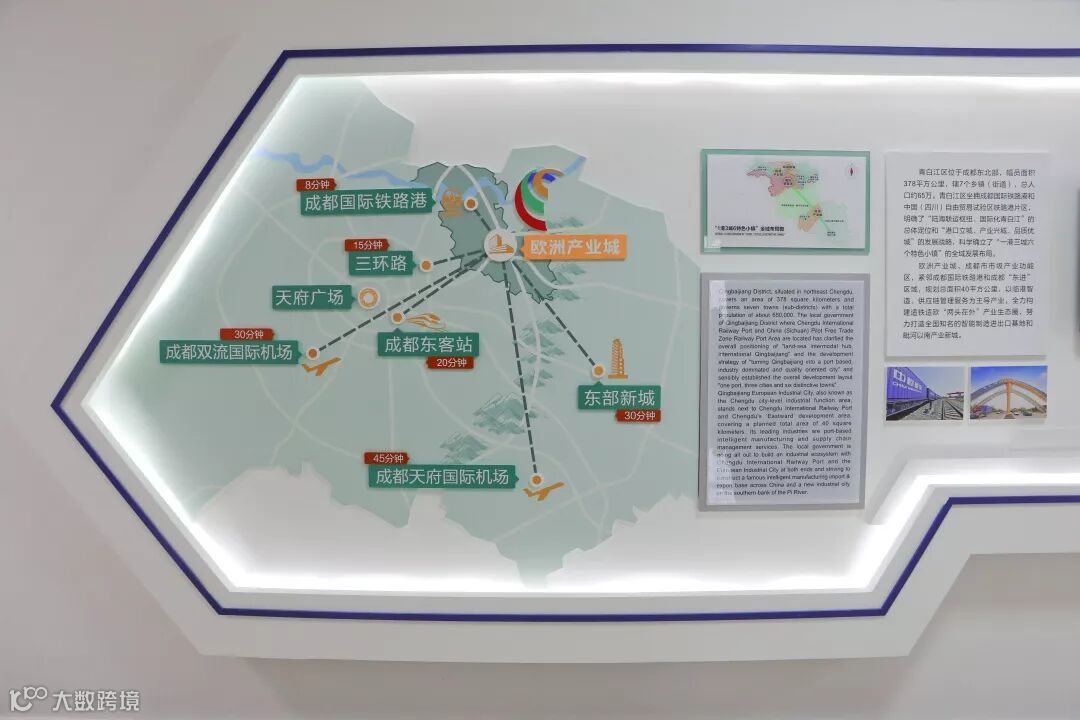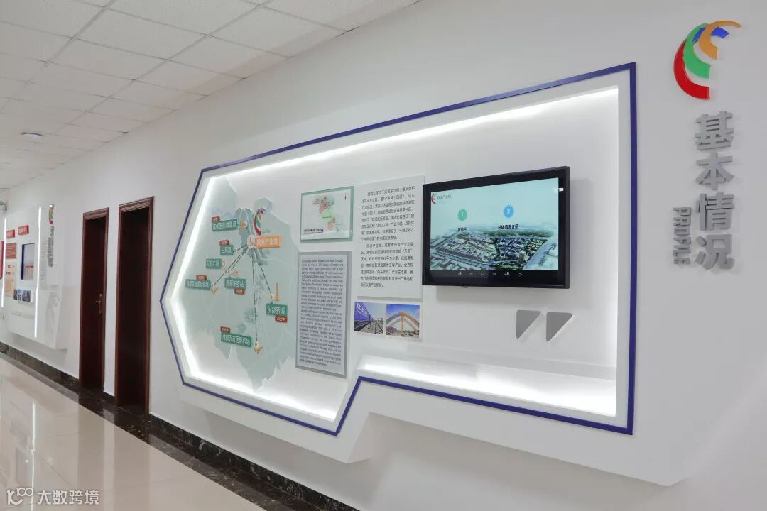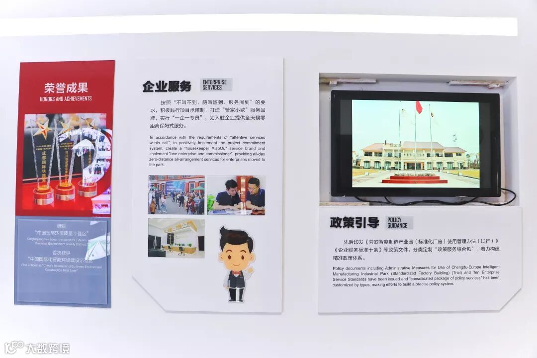 智能化的展示屏,国际范儿的展厅风格,根据欧洲产业城建设发展情况,将宽敞的廊道划分了为五大板块。