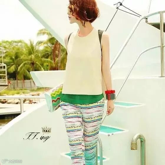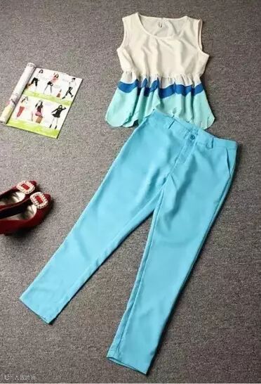 套装,180元。背心+长裤套装,散摆背心,遮住小肚腩,配色清爽。