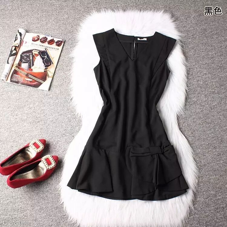 连衣裙,80元。剪标连衣裙,V领修饰脸型,裙摆大蝴蝶结装饰,可爱俏皮。
