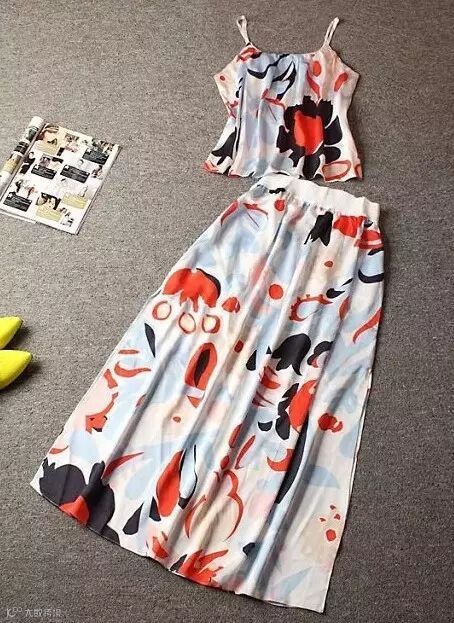 套装,135元。吊带+半裙套装,清爽吊带,开叉半裙,配色柔和,花样大牌。