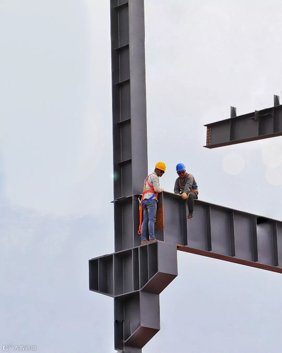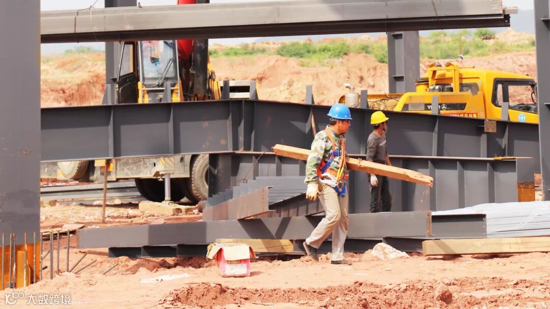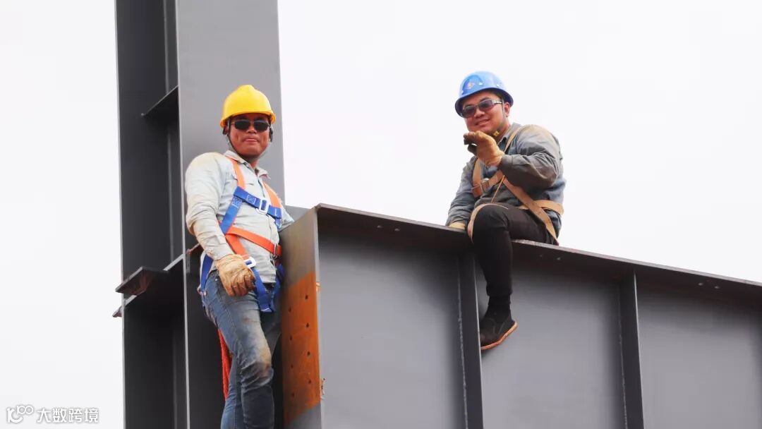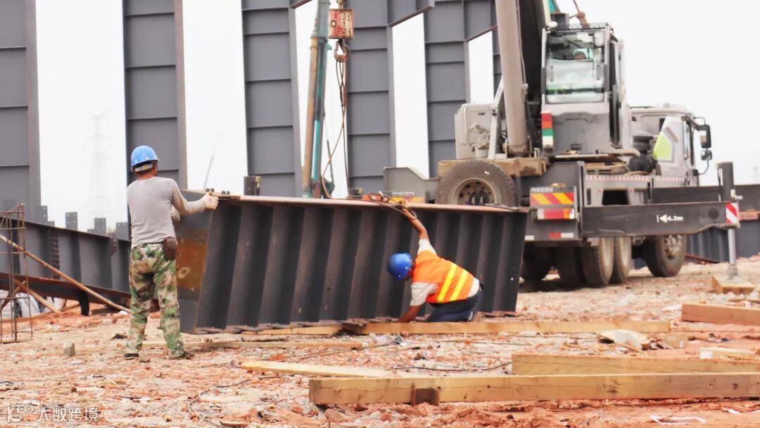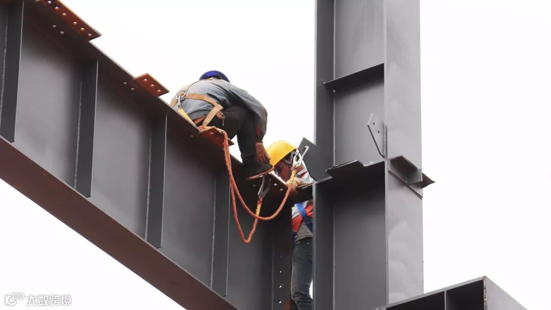 高空烈日下的钢架映出工人影影绰绰的背影,