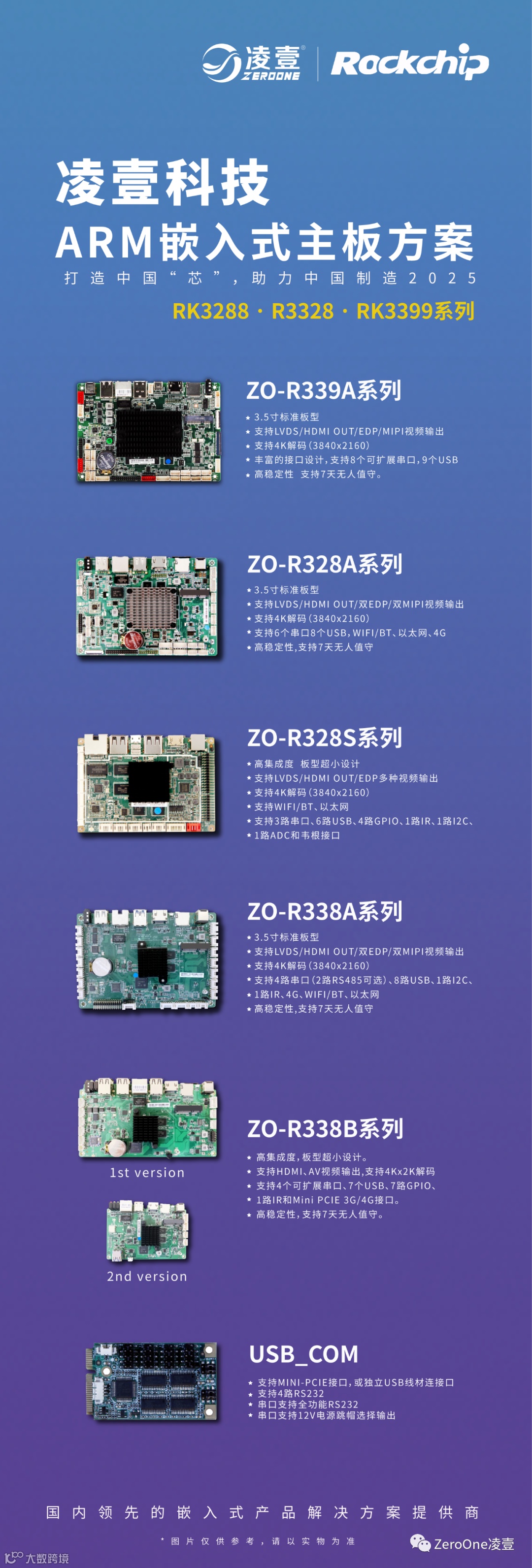 基于ARM平台,凌壹科技组建了一只专业的产品研发队伍,并与瑞芯微达成战略合作伙伴关系,并率先推出了一系列国产化成熟单板及整机产品,为客户提供一站式产品研发服务。产品应用行业涉及:多媒体广告机、收银POS机、互动数字标牌、触摸一体机、工控机、人脸识别终端、自助售货机、机器人、医疗设备等。