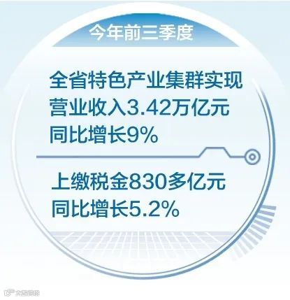 集群规模稳步壮大。今年前三季度,全省特色产业集群实现营业收入3.42万亿元,同比增长9%;上缴税金830多亿元,同比增长5.2%。
