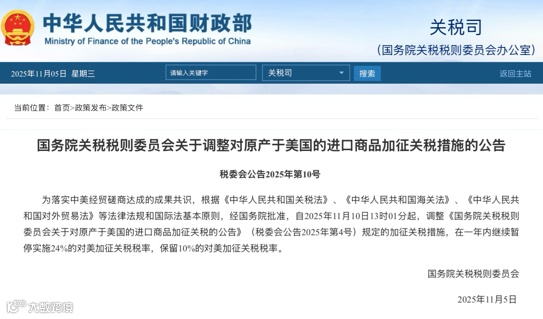 11月5日,国务院关税税则委员会发布公告,明确两项对美加征关税调整措施:一是自2025年11月10日13时01分起,停止对原产于美国的部分商品加征关税,包括棉花(15%)和大豆(10%)等商品;二是自同一时间起,在一年内继续暂停实施24%的对美加征关税税率,保留10%的税率。此前中美双方互征对等关税为34%,今年8月斯德哥尔摩会谈后已将其中24%暂停延期至今年11月10日。