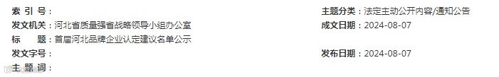 根据《河北省品牌优势和示范企业培育行动方案》,经企业自愿申报、资料初审、专家评审、征求意见等程序,产生了首届河北品牌企业认定建议名单,现予以公示,广泛听取意见。公示期为5个工作日。如有相关意见建议,请于2024年8月13日前工作日内,以传真、电子邮件或信函等形式向省质量强省战略领导小组办公室反映(信函以到达日邮戳为准)。反映意见请用真实姓名、单位。个人提出意见的,应当在材料上签署本人姓名,注明联系电话、通讯地址,并提供身份证明;单位提出意见的,应当在材料上注明住所及联系电话、通讯地址,并加盖单位公章。