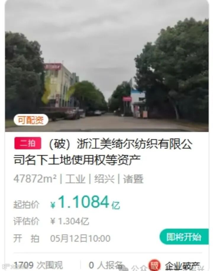 消息传来!绍兴知名纺织企业浙江美绮尔纺织有限公司名下土地使用权等资产即将公开拍卖!起拍价1.1亿元,光是参与拍卖就需要缴纳一千万元保证金!