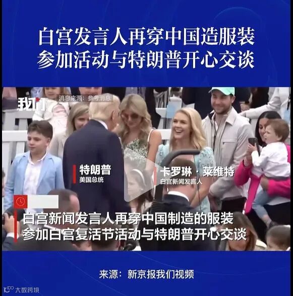 据参考消息报道,4月21日白宫新闻发言人穿着中国制造的服装,参加白宫复活节活动与特朗普开心交谈。报道称,白宫新闻发言人穿着的蓝色蕾丝连衣裙为英国品牌,但这件连衣裙在网站的详情页上标有中国制造的字样。此前,白宫新闻发言人就曾穿着中国制造的红色裙子参加一新闻发布会引热议。