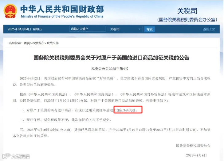 4月4日,中国决定自4月10日12时01分起,对原产于美国的所有进口商品在现行适用关税税率基础上加征34%的关税进行精准反制。