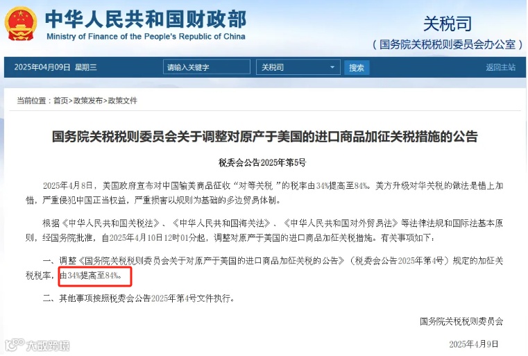 4月9日晚间国务院税则委员会发布公告,自2025年4月10日12时01分起,调整《国务院关税税则委员会关于对原产于美国的进口商品加征关税的公告》(税委会公告2025年第4号)规定的加征关税税率,由34%提高至84%。