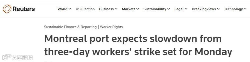 9月27日,代表蒙特利尔港码头工人的工会发出了72小时的罢工通知,码头工人将从周一(30日)早上7点开始,在Termont Montreal旗下的两个码头--Viau和Maisonneuve码头举行罢工,罢工可能会持续到周四。